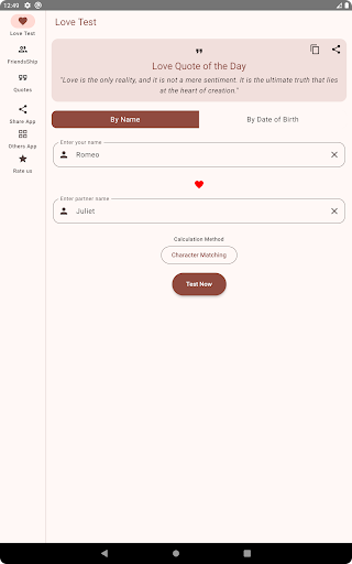 Love Calculator : Love Tester is on the top of the list of Entertainment category apps on Google Playstore. It has got really good rating points and reviews. Currently, Love Calculator : Love Tester for Windows has got over 50+ App installations and 0 star average user aggregate rating points.