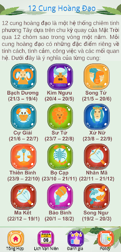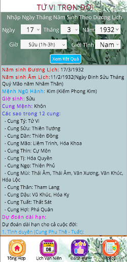 Lịch Vạn Niên-Tử Vi is on the top of the list of Tools category apps on Google Playstore. It has got really good rating points and reviews. Currently, Lịch Vạn Niên-Tử Vi for Windows has got over 50+ App installations and 1.0 star average user aggregate rating points.