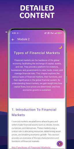 Financial Markets Course is on the top of the list of Education category apps on Google Playstore. It has got really good rating points and reviews. Currently, Financial Markets Course for Windows has got over 100+ App installations and 0 star average user aggregate rating points.
