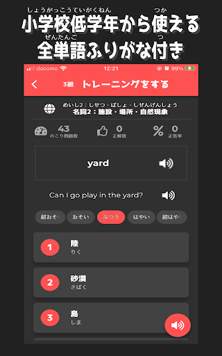 小学生からの英検®単語[3級・4級・5級] is on the top of the list of Education category apps on Google Playstore. It has got really good rating points and reviews. Currently, 小学生からの英検®単語[3級・4級・5級] for Windows has got over 100+ App installations and 0 star average user aggregate rating points.