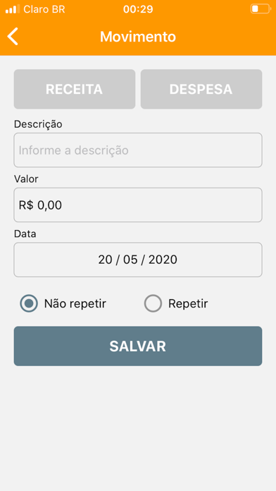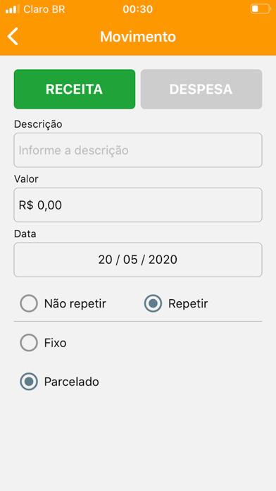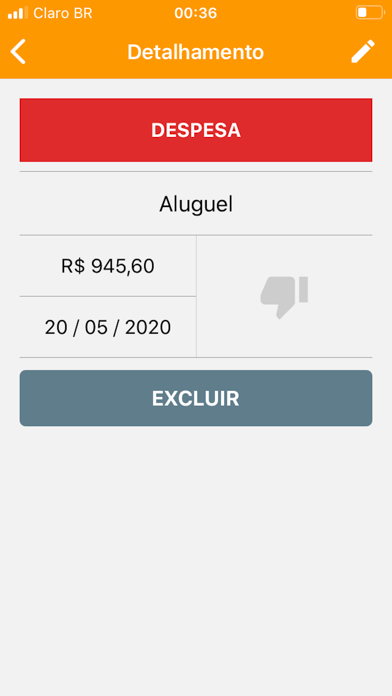 | ● It is also possible to indicate if the expenditure repeats during the months of fixed form (every month) or installment (specific amount of months). Detail Screen - displays the details of the movement. |