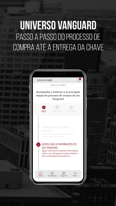 | ● Os principais documentos do seu apartamento, sejam plantas, boletos ou extrato, disponíveis para consulta e download a qualquer momento. Tudo em poucos cliques De onde você estiver, poderá conferir a timeline que traz o passo a passo do processo de compra até a entrega das chaves, tirar dúvidas e acompanhar cada etapa da construção do seu Vanguard. |