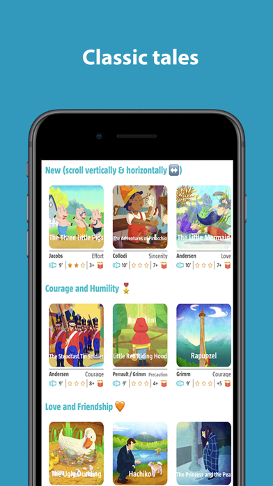 | ● We know that your kids will like it so much that it is best to play the story with the device rotated horizontally in order to enjoy all its details in full screen mode. 3 - Original Stories With Kid’s Tales we offer you classic stories, some more than 300 years old! We have adapted the stories to make them easier for children, but with the maximum fidelity respecting the original versions of great authors like Perrault, Andersen and the Brothers Grimm. |