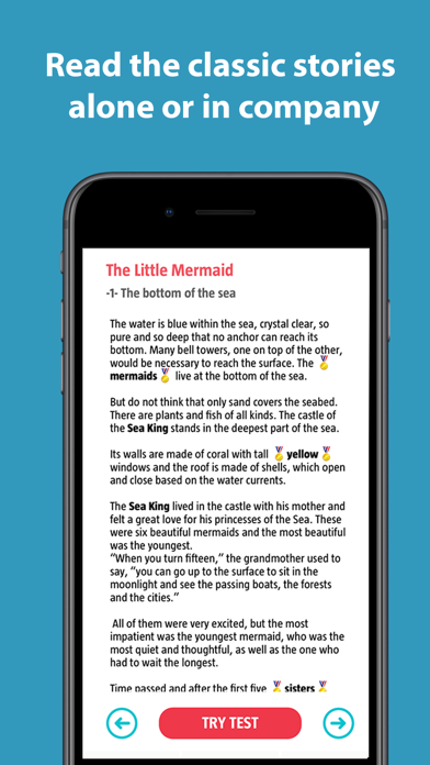 | ● At the end of each story, you can review the vocabulary and do a test to get some stars. Here you will find FREE: - The three little pigs - The Little Red Riding Hood - Rapunzel - The Little Mermaid - Cinderella - Pinocchio - The Tin Soldier - The Princess and the Pea - The Ugly Duckling - The Frog Prince - Hachiko We give you 10 reasons to download the app. 1 - Free App Kid’s Tales is a free application, with which children can learn languages by listening to or reading the most famous stories. |