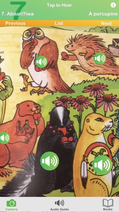 | ● Just tap Update Now when it appears below one of your books. Camera Mode - Tap the Camera to enter Camera mode - Look at the page through your iPhone or iPads camera. - Looking at the first page of each unit will set the current section; or you can select it from the list by tapping Llist. - Explore the page and play buttons will pop up right on the page! - Tap the buttons to hear the Hidatsa words. *Image recognition performance may vary depending on device. |