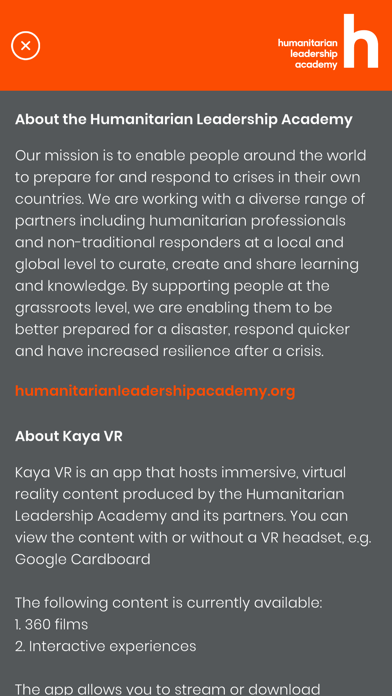 | ● Kaya VR is an app that hosts immersive, virtual reality content produced by the Humanitarian Leadership Academy and its partners. |