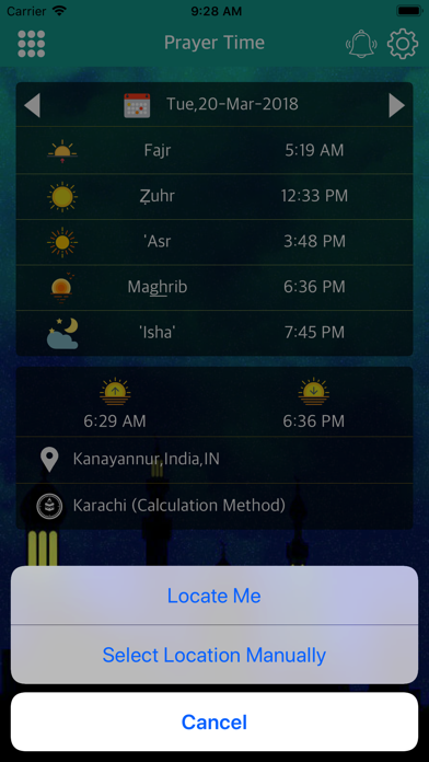 | ● A user can search the prayer timings of another location by clicking the location icon. |