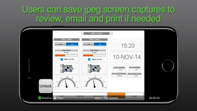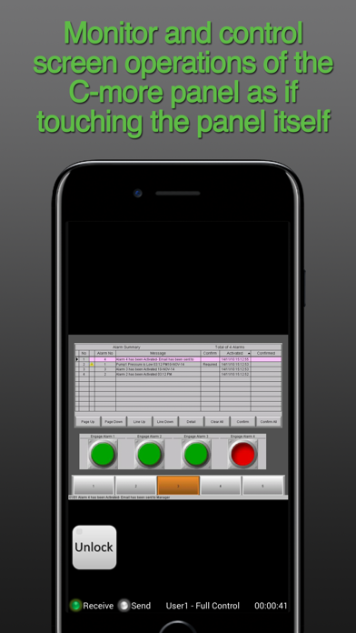 | ● See the app note on the support.automationdirect.com web page for more details (App Note AN-EA-017). Main Features of this App. - Monitor and control screen operations of the C-more panel as if touching the panel itself - Users can save jpeg screen captures to review, email and print if needed - The iPhone or apple Zoom feature allows the user to zoom in on specific objects on the screen and then save a screen capture if needed - Multilevel Logon Security offers three Remote Access user accounts that can be configured and stored in the panel project. |