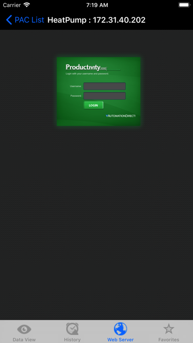 | ● Main Features. - Monitor designated discrete and integer values within the PAC - Access Alarm and Event History - The iPhone or apple Zoom feature allows the user to zoom in on specific values on the screen and then save a screen capture if needed - Separate Security Logon requirements offers additional protection for your data. • All current Productivity3000 CPUs support the PACData app. • The Productivity3000 CPU must be using firmware Version 1.1.13.x or later. |