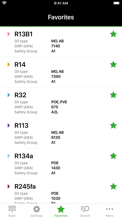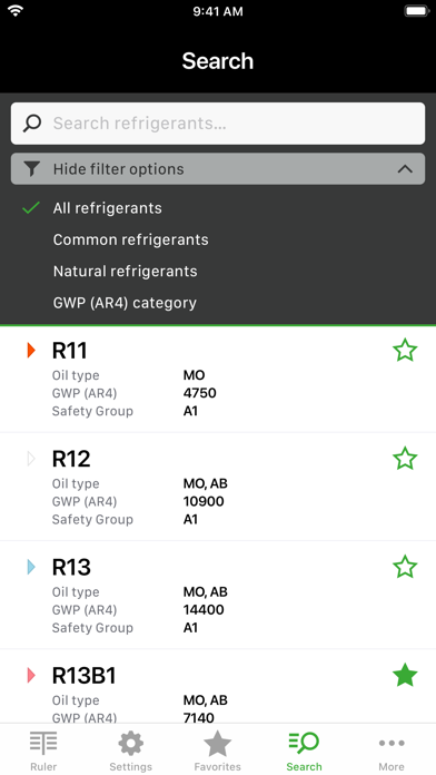 | ● The tool provides an intuitive user interface for easy and accurate temperature-to-pressure conversion, while allowing easy use and switching between different metric (SI) and imperial (IP) units (under Settings). // CURRENTLY AVAILABLE REFRIGERANTS // ▸ The app contains data and information on more than 100 natural and synthetic refrigerants, which can also be preselected by filter functions (under Search). ▸ For comparison purposes and also for practical use in service and operation of older existing systems, information on previously used refrigerants, which may have been affected by usage restrictions, are also provided. // MAIN FUNCTIONS // ▸ Search filters and favourites: Under the navigation item Search or via predetermined Search filters or manual entry in the text field the appropriate refrigerant can be found and, if necessary, added to the favourites by tapping the star symbol. |