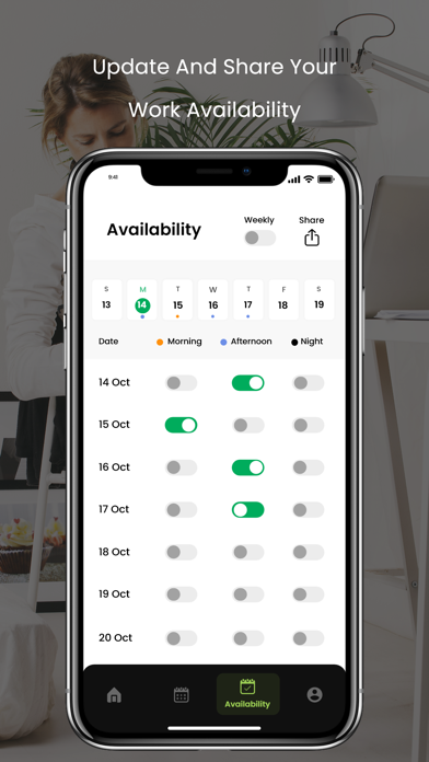 | ● It is simple: Download the app, create a quick profile Add your manager(s), Toggle when you can work and select ‘share’. They will instantly receive email with your availability, and you’ll improve your chance to pick up more work. If your place(s) of employment also use Colleago, they can easily notify you via the app of available shifts, which you can accept or decline via the App. |