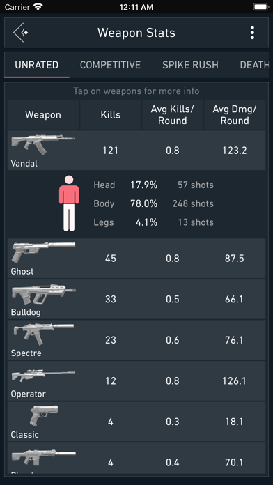 | ● This data is then displayed to players in the form of beautiful graphs that are simple to digest. Detailed Match Results: Spike Stats provides detailed information for each individual match players has completed. |