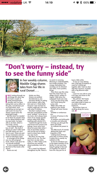 | ● Every issue is packed with feel-good short stories, serial instalments, cookery, craft, knitting, puzzles and health, as well as fascinating features on scenic locations around the UK. |