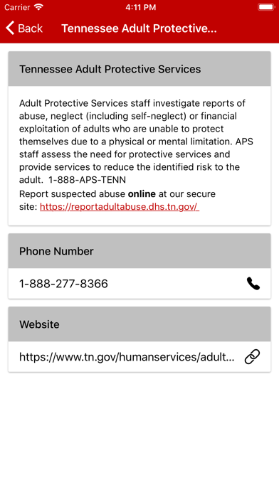 | ● The app focuses on appropriate resources and screening to help by helping to identify state and local agencies, screening tools, and contact information or appropriate reporting and assistive agencies. |
