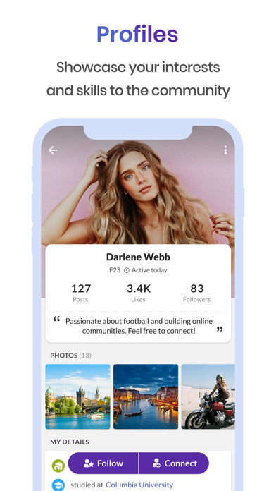 | ● Of course, you can create your own private groups and invite other members to join. • Anytime you have a question or need a recommendation or feel like sharing something with your community, just head to the feed and start interacting. • Use the Gallery to share all your beautiful moments with your community. • Free to meet? Just shake your phone and Milo will instantly connect you with others who are also free. |