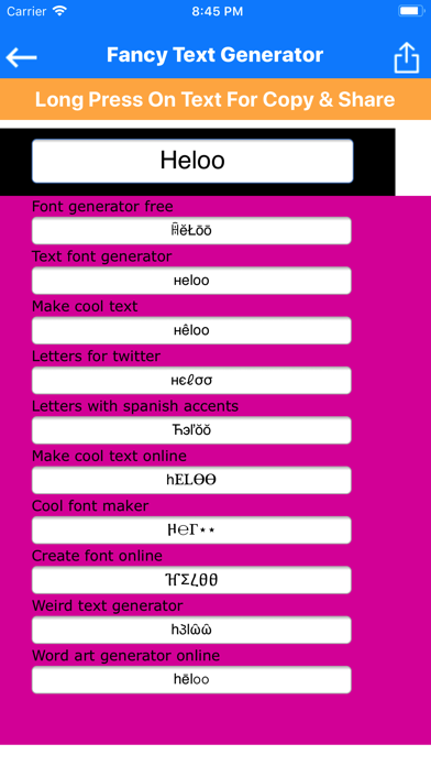 | ● Fancy Text Generator Fancy Text Generator is a stylish text generating app that allows you to create cool, funky and stylish text for Facebook, WhatsApp and Twitter. You can use Fancy Text Generator to create lots of different styles of text with different fonts which can be later used in Facebook / WhatsApp statuses and also for tweets on Twitter. |