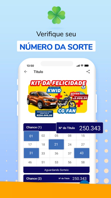 | ● O app da sorte, app pé-quente, app com muitos ganhadores…chame como preferir, e aproveite a chance de ter uma experiência completa com a sorte! E com muitas vantagens: Seu ponto de venda na palma da mão: Compre até às 23h59 do sábado, sem sair de casa, ou aonde estiver; Pagamento: Praticidade para pagar com cartão (crédito e débito), boleto e até via Pix Dezenas no App: Sabe aquele número da sorte? Use ele aqui no app pra escolher as dezenas (nas compras com cartão de crédito); Resultado: Confira os resultados e confira a história dos milhares de ganhadores; Título para um amigo: Quer presentear alguém? Dê um título da sorte para essa pessoa especial; Notificações exclusivas: Informações em 1ª mão sobre os títulos, sorteios, premiações e resultados; SAC 3.0: Atendimento humanizado, facilitado e dinâmico; Tudo em um só lugar: Compre mais de 1 título e veja todos no app. Direito de resgate: Ao comprar o seu título e ceder o Direito de Resgate, você ajuda a Instituição beneficiada e concorre a prêmios incríveis. |