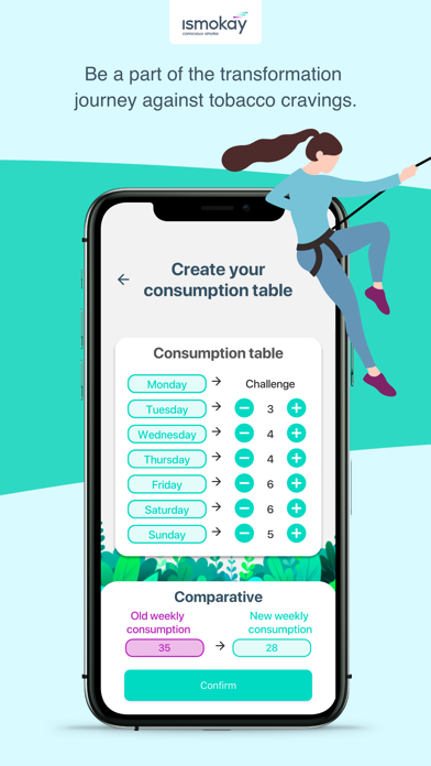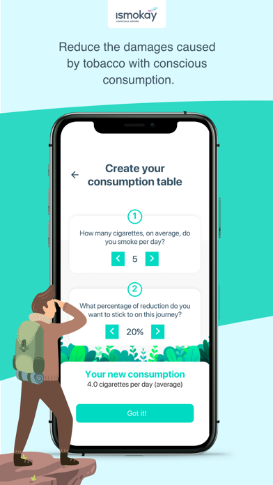 | ● Then you just follow the plan and over time, make adjustments based on your evolution. SCHEDULED REDUCTION: This is an intermediate journey, in which you define what level your consumption starts and, each week at your own pace, you may reduce your consumption table the way you want. QUIT SMOKING: This journey is for those who wants to quit smoking or will quit now, right after downloading Ismokay. |