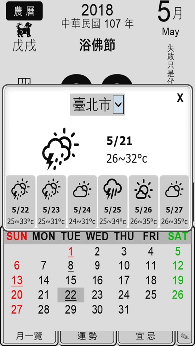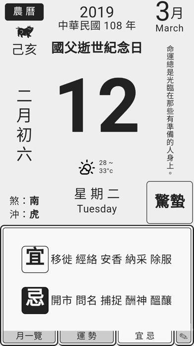 Showing the date of the Lunar Year, and weather temperature information of today and current week as well. Monthly view provides quick and easy look of the holidays and festivals every month. The daily fortune results and the direction of red and act and other information are for reference only. Please don be too superstitious. Motto is hoping to inspire your every day life .