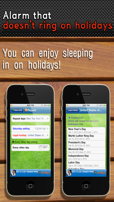 | ● NEVER download another iPhone Alarm App Again! Music Alarm includes an Mp3 Alarm, Voice Recording Alarm, Holiday Alarm, Preselect Hourly, Daily and Sleep in Settings! ** Do you want wake up to your FAVORITE songs? **Do you want wake up to the voice of your girlfriend or boyfriend? **Do you forget important holidays? If you answered YES to these questions then Music Alarm is PERFECT for you! :::::::::::::::::::::::::::::::::::: APP REVIEWERS :::::::::::::::::::::::::::::::::::::::::::: My personal favorite feature is the record option. |