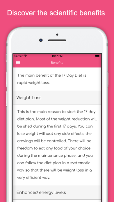 | ● I personally researched all of the most accurate and scientific info, and collected it in this App. The 17 Day Diet Guide covers: -The Basics: The 3 Main Cycles -The Benefits: Weight and Fat Loss -Dangers and Side-Effects -FAQ: Frequently Asked Questions -How to Get Started -Foods: Cycle 1 -Foods: Cycle 2 -Foods: Cycle 3 -Tips To Staying On Track -Recipe Links Let us know what you would like to see added, Thanks!. |