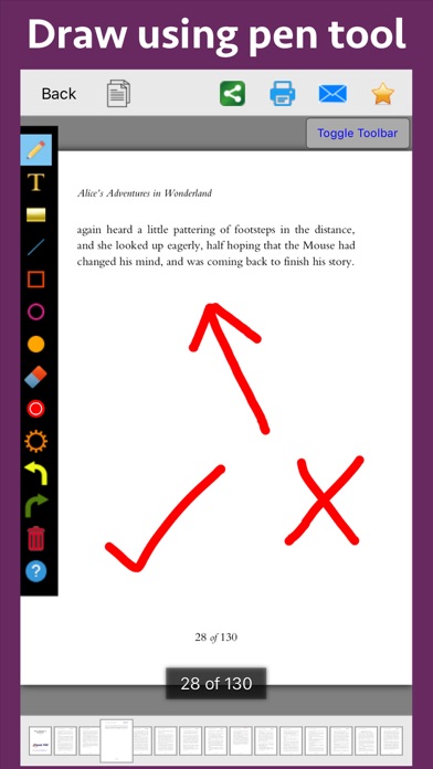| ● Write text on PDF, Highlight, underline ,draw shapes & customise using different Fonts, text size, colors and transparency level. |