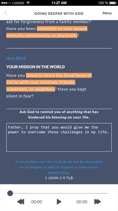 | ● You can do the audio and written portions entirely through this mobile app on your phone or tablet, or you can use just the audio function in combination with our printed retreat guide, Going Deeper with God.. |
