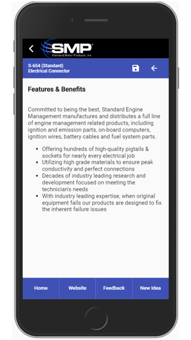 | ● Here’s what you can do with the new SMP Parts App 3.0: • Competitor UPC Scan: Scan a competitors UPC code to learn SMPs equivalent parts listing • License Plate Lookup: Enter a license plate number to see all available SMP parts for that particular vehicle • Cross Reference Search: Just like on our eCatalogs, you can now use xRef searches to find the parts you need • Robust Search History/Saved Vehicles: Weve added several time-saving features, including a robust search history and saved vehicles, which you can add either manually or during a Year/Make/Model search • Enhanced User Interface: Our redesigned interface with an intuitive layout and large icons makes it even easier to access SMP parts • SMP UPC Scan: Scan the UPC code on any SMP box and instantly receive all of the applicable part information, including installation instructions, features and benefits, and install videos In addition to the features above and our option to submit a New Product Idea, the SMP Parts App 3.0 still offers the essential built-in tools that made Version 2.0 an award-winning app. |