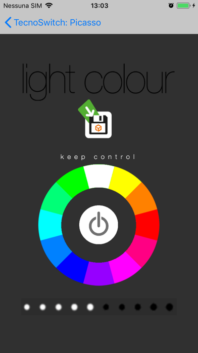 | ● Grazie a questa semplice app è possibile controllare il colore e lintensità luminosa della vostra lampada Picasso con iPhone ( iOS7+) Premendo lanimazione della schermata iniziale si stabilisce il collegamento con la lampada Picasso (WiFi). La sezione di controllo è semplice ed intuitiva: una tavolozza di colori, unicona ed una barra. Dalla tavolozza di colori è possibile selezionare uno dei tanti colori disponibili che Picasso riprodurrà per il vostro ambiente. |