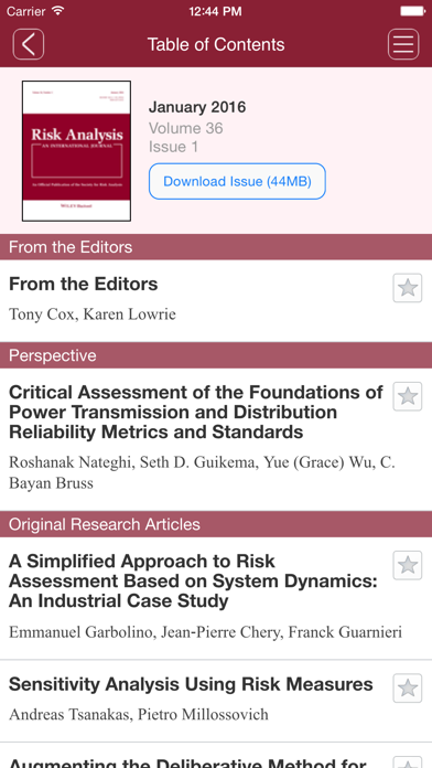 | ● Risk analysis is broadly defined to include risk assessment, risk characterization, risk communication, risk management, and policy relating to risk, in the context of risks of concern to individuals, to public- and private-sector organizations, and to society at a local, regional, national, or global level. CURRENT SUBSCRIBERS to Risk Analysis can “pair” their device with their personal or institutional subscription to enjoy full access in this iPad edition. SUBSCRIBE IN THE APP: Annual Subscriptions (12 issues) for the iPad-only edition are available for $199.99 (US) per year. |