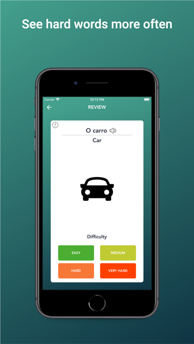 | ● Use flash cards to master frequently used, core vocabulary. Build a daily habit of learning 5 words a day to see long term progress. - Flip the flashcards to find out the meaning of the Brazilian Portuguese words. |