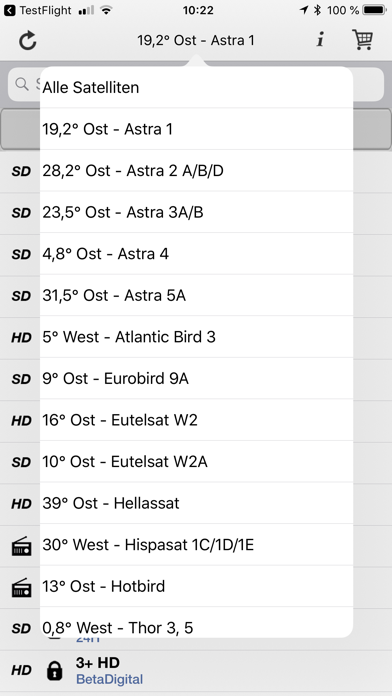 | ● Durch die Favoritenliste lassen sich oft benötigte Sender schnell auffinden und aufrufen. Derzeit werden die Frequenzdaten folgender Satellitenpositionen täglich aktualisiert: 19,2 Grad Ost - Astra 1 (in der Basisversion gratis enthalten) 28,2 Grad Ost - Astra 2 A/B/D 23,5 Grad Ost - Astra 3A/B 4,8 Grad Ost - Astra 4 31,5 Grad Ost - Astra 5A 13 Grad Ost - Hotbird 16 Grad Ost - Eutelsat W2 42 Grad Ost - Türksat 2A/3A 39 Grad Ost - Hellassat 9 Grad Ost - Eurobird 9A 5 Grad West - Atlantic Bird 3 30 Grad West - Hispasat 1C/1D/1E 0,8 Grad West - Thor 3, 5 Unsere Angebote: 1 Jahr die erweiterte Version mit allen Satelliten - 4,99 € / Jahr* Werbung in der gesamten App deaktivieren - 4,59 € einmalig *Die Mindestlaufzeit beträgt ein Jahr. |