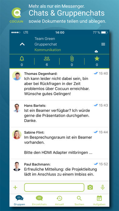 | ● Cocuun ist sicherer Messenger, Collaboration-Tool, Teamwork-App, Cloud-Speicher, Social Intranet sowie einfaches Projektmanagement-Tool in einem. 1. |