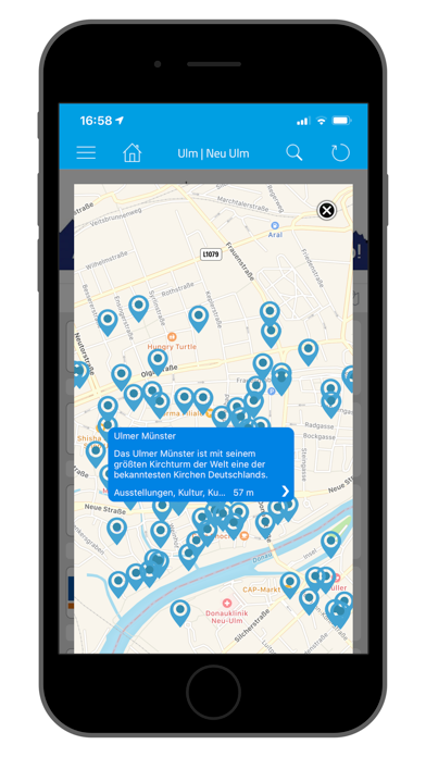 | ● In der App hast du sofort Zugriff auf die Kontaktmöglichkeiten per Telefon, Email, direkte Verlinkungen auf Online Shops, Webseiten oder YouTube und Facebook. Die Ulm | Neu Ulm App bietet verschiedene Vorgehensweisen, wie du deine Informationen suchen kannst: du kannst über den Kategoriebaum thematisch vorgehen, über die Volltextsuche, die App nach den gewünschten Schlagworten durchsuchen oder einfach nur schmökern. Alles kannst du dir nach Entfernung, Relevanz oder Datum als Liste sortieren lassen oder auf einer Karte eingetragen ansehen. Die Ulm | Neu Ulm App ist eine neue Art von regionaler App: umfassend, übersichtlich, aktuell und jeden Tag neu.. |