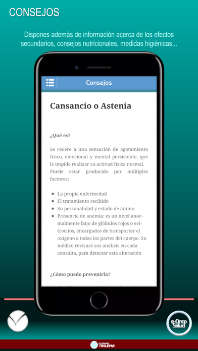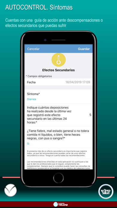 | ● Incluye además registros de estado general, control de dolor y otros cuestionarios de evaluación y cumplimiento terapéutico. • SÍNTOMAS y EFECTOS ADVERSOS: El paciente cuenta con un protocolo específico de actuación ante la aparición de síntomas o descompensaciones. |