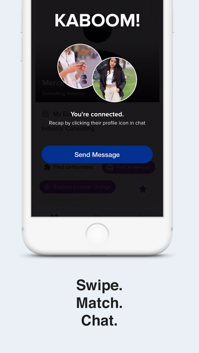 | ● CHAT.** Swipe a profile right if you’d like to connect, swipe left if you don’t. Kaboom! You matched. |