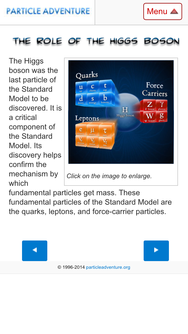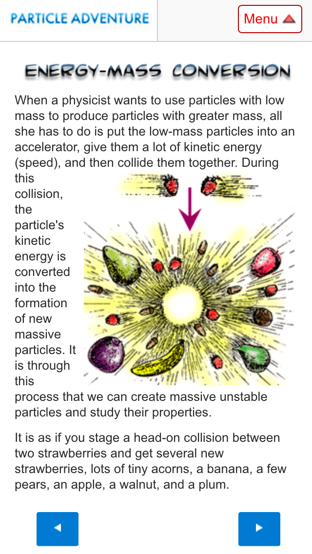 | ● The Particle Adventure is an interactive introduction to the world of quarks, the Higgs boson, neutrinos, antimatter, the fundamental forces, extra dimensions, dark matter, accelerators and particle detectors. |