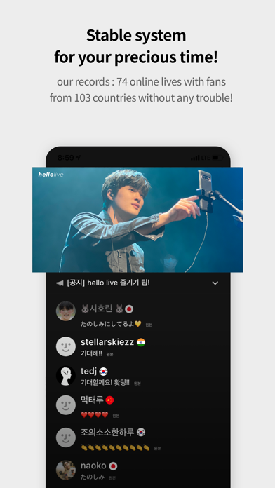 | ● Meet your KPOP star closer! Whenever and wherever you want. On 76 lives over the past year, Fans from 103 countries and 100 global artists have met on hellolive. Focusing on talking to stars. |