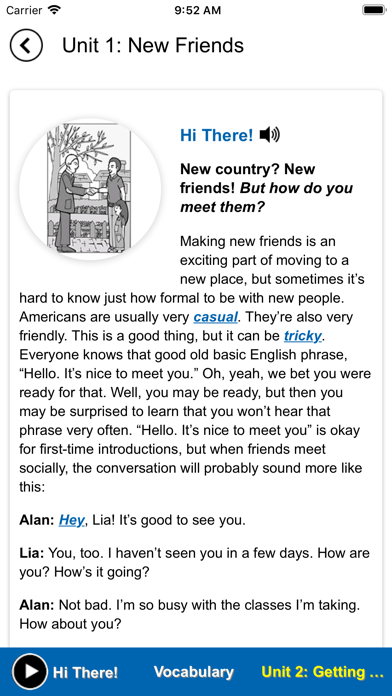 | ● Listen to the audio for native speaker pronunciation of the dialogues, then play it again to practice! Look for grammar reminders, idiomatic expressions, culture tips, and fun facts. |