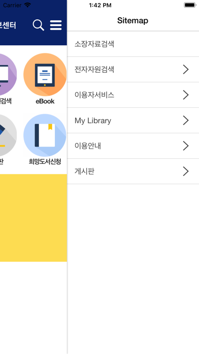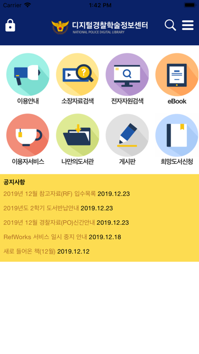 1.도서관 안내 - 이용시간, 시설안내, 서비스별 이용안내, 센터소개를 제공합니다. 2.공지사항 - 경찰대학 김구도서관의 공지사항 서비스를 제공합니다. 3.소장자료검색 - 경찰대학 김구도서관의 소장을 검색하는 서비스를 제공합니다. 4.My Library - 대출사항 조회 및 개인공지사항 서비스를 제공합니다. 5.전자자원검색 - 전자저널, eBook서비스를 제공합니다(로그인은 별도로 필요합니다). 6.이용자서비스 - 상호대차, 교외접속서비스, 타대학 도서관 열람안내에 대한 설명을 제공합니다.