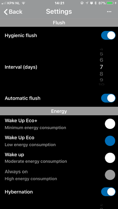 | ● By activating the hygienic flushing it’s possible to adjust the flushing interval so that the water is refreshed in the toilet and the built-in cistern. |