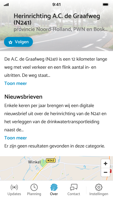 | ● de GraafApp vind je: • omleidingsroutes en bereikbaarheid • informatie over de werkzaamheden en planning • het laatste nieuws • de mogelijkheid om je aan te melden voor pushberichten • foto’s, video’s en een animatie van de weg in de toekomst • meer informatie over het project • projectnieuwsbrieven • de mogelijkheid voor contact met de aannemer Herinrichting A.C. |