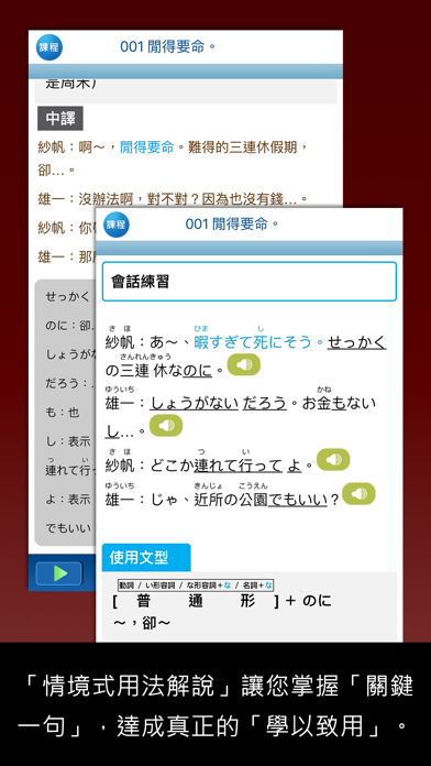 | ● 重視深度與廣度,四大途徑完整教學「每日一句」 「花30分鐘完整學習一句話所隱含的規則性文法」,並掌握「適時、適地、適人」的使用時機,達成「深入、完整」的有效學習。 透過精心安排的4單元學習途徑,有助於「複製會話中的文法規則,自我揣摩運用;並從實際應答領會日本人如何運用於臨場溝通」,達成真正的「學以致用」。 (1)【文型圖解】:圖像化的文型解說,解構句子的構成要素 (2)【使用文型】:提示日本人經常使用的「表現文型」 (3)【用法解說】:「情境式」用法說明,掌握「適時、適地、適人」的使用時機 (4)【會話練習】:大量介紹「具體的會話場面」,模擬「與日本人互動的假想體驗」 ◎ APP學習功能特色 學習功能完備,可根據自己的學習節奏與程度,進行個人化設定: 1. |