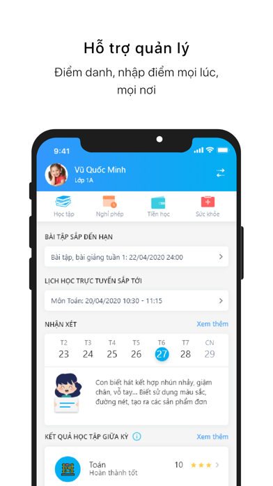 | ● Điểm danh - Cho phép giáo viên chủ nhiệm, giáo viên bộ môn điểm danh học sinh đi học, vào muộn, bỏ tiết và gửi thông báo đến cho phụ huynh. 3. |