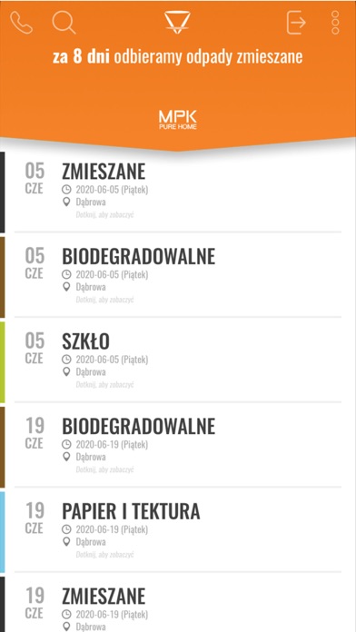 | ● MPK Pure Home to aplikacja mobilna, zawierająca harmonogram odbioru odpadów komunalnych, który obejmuje Gminy obsługiwane przez Spółkę. |