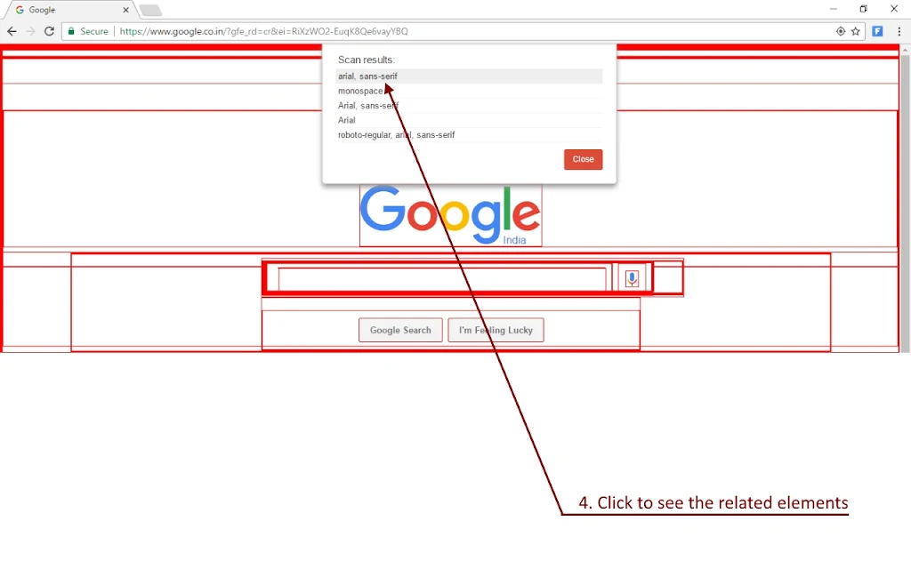 From the page scan results, FontScanner can also show the elements related to a specific font name. This helps in identification of the specific element that has the undesired font name.
