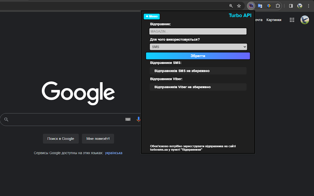 Важливо, для коритування, потрібно зарєструватися у TurboSMS.ua, розширення не замінює повністью TurboSMS.ua, а йде як доповнення до нього.