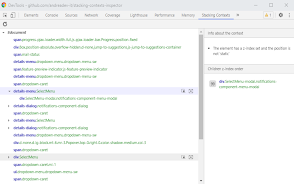 Helps inspecting the css stacking contexts and solving the z-index war.