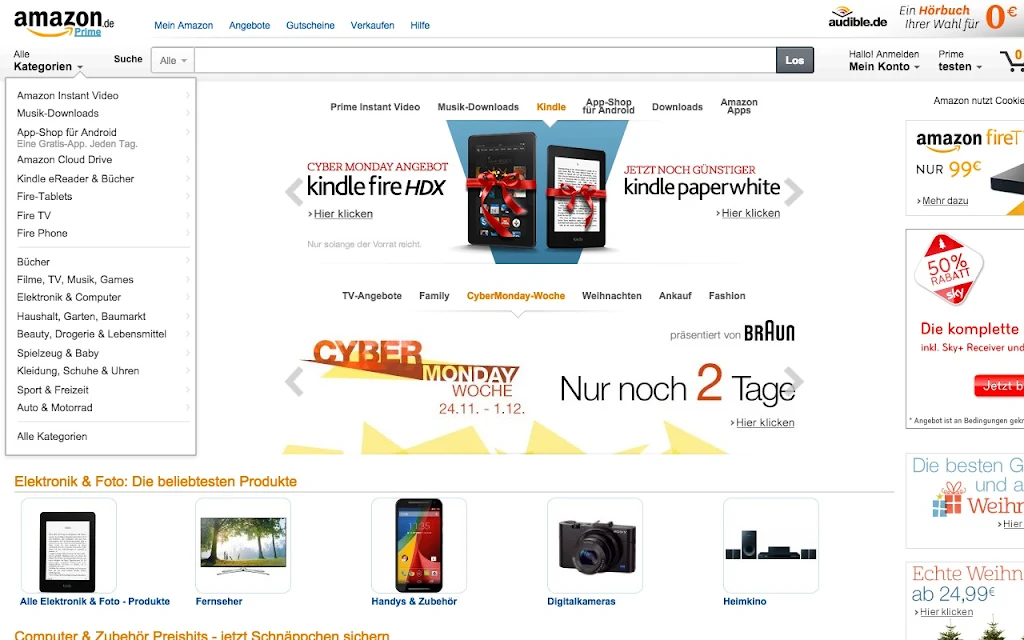 Kategorien auf Amazon.de sind unteranderem Bücher, Kindle Store, Filme & TV, Musik, Spiele und Spielwaren, Elektronik, Haus und Garten, Auto, Baby, Schönheit, Kamera & Foto, Handys und Zubehör, Bekleidung, Computer und Zubehör, Games & Gourmet, Gesundheit & Wellness, Heimwerken, Industrie & Wissenschaft, Schmuck, Küche, Zeitschriften, MP3, Musikinstrumente, Office-Produkte, Patio, Rasen & Garten, Schuhe, Software, Sport und Freizeit, Amazon Video On Demand, Video, Videospiele, Uhren und viele weitere – einfach auf Amazon.de entdecken.