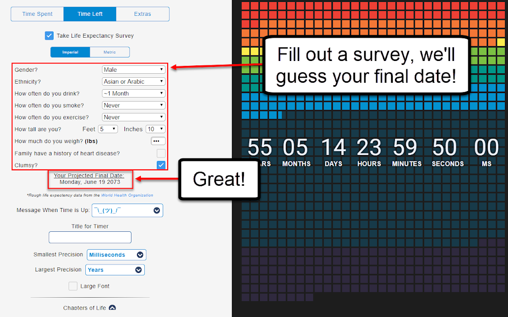 It can also countdown to your death, countdown to a deadline, or show you how many people are older or younger than you globally.